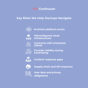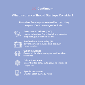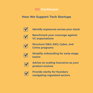This carousel outlines the key insurance solutions that matter for early-stage and growing tech companies, plus how Continuum helps founders navigate emerging risks.